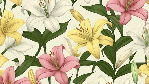 Ogled celotnih podrobnostiTapeta lilija | Živahen vzorec roza, rumenih in belih lilij na nevtralnem ozadju