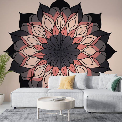 WonderMuralTa osupljiv mural tapete prikazuje mandala vzorec z nežnimi konturami, ki vključuje harmonično mešanico roza prehodov in črne barve. Tekoče linije ...