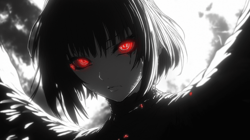 WonderMuralTa manga fotografska tapeta zajema zanimiv lik z rdečimi očmi, ki ustvarja dramatično in očarljivo vzdušje. Kontrast med črno in belo ilustracijo p...