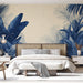 Tapeta bež z vzorci listja | Eleganten tropski dizajn v odtenkih modre