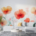 Ta ta foto behang z vzorci cvetja, ki prikazujejo vodne barve cvetja v odtenkih rdeče in oranžne na mehki in oblačni podlagi, navdihuje lahkost in spomladansko vzdušje. Subtilni odtenki zelene, ki dodajajo dotik svežine, prikličejo zgodnje pomladne dni, kar naredi ta dizajn idealen za vnašanje občutka obnove v katerikoli prostor.