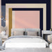 Ta ozadje z zidnim poslikavom prikazuje očarljiv geometričen dizajn, s pravokotnimi vzorci, ki se izmenjujejo med nežnimi toni in temnejšimi barvami. Odtenci rožnate, bež, zlate in temno modre ustvarjajo popolno ravnovesje med sofisticiranostjo in modernostjo.