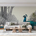 Ta fotografska tapeta prikazuje veličastnega pisanega pavlina, ki ponosno sedi na robu vodnega toka, obdan s stiliziranim listjem in kamni. Živahne barve pavlina se harmonično prepletajo z monokromatskimi vzorci dreves in rastlin, ustvarjajoč očarljivo podobo, ki pritegne pogled.