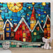Odkrijte naše fotografske ozadje, navdihnjeno z barvnim steklom, ki prikazuje očarljivo vas z zasneženimi strehami, obsijano s svetlobo zvezd in sonca. Živahne in svetle barve, vključno z odtenki rdeče, zelene in modre, ustvarjajo toplo in prijetno vzdušje.