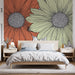 Ta ozadje s stenskim muralom poudarja lepe stilizirane cvetove v odtenkih oranžne in zelene barve, ki se izstopajo na ozadju nežnih cvetličnih vzorcev. Veliki cvetovi prinašajo živahen in dinamičen dotik, medtem ko črno-belo ozadje ustvarja pomirjujoč kontrast.