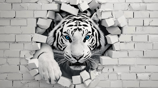 Art'loloFörvandla ditt utrymme med denna slående 3D tiger fototapet, som visar en vit tiger med genomträngande blå ögon som kommer fram genom en tegelvägg....