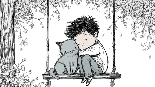 WonderMuralDenna charmiga Fototapet framhäver ett sött barnsligt motiv som visar en pojke som kramar sin katt i en gunga. Den ömtåliga illustrationen, med fin...