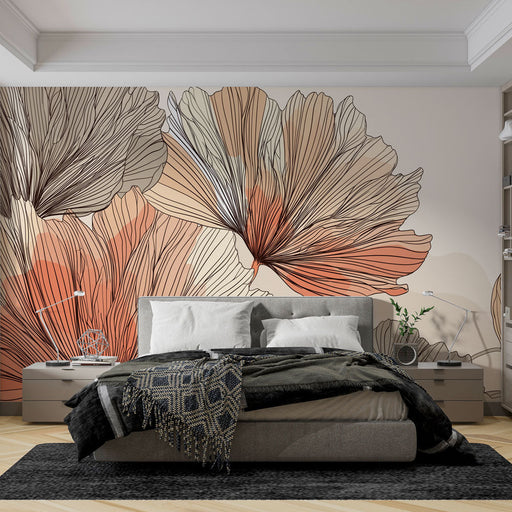 WonderMuralVår fantastiska Fototapet visar ett vackert motiv av delikata blommor i mjuka nyanser av rosa och beige, perfekt framhävda av fina, grafiska linjer...