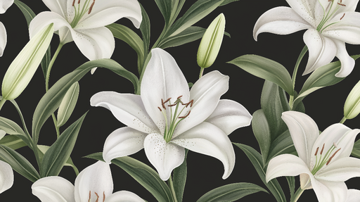 WonderMuralMajestätiska liljor på svart bakgrund En sann uttryck för naturlig elegans, denna tapet har ljusa vita liljor med konstnärlig precision på en djup ...