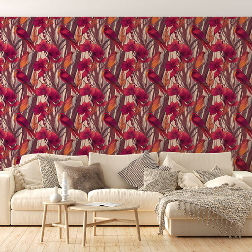 WonderMuralDenna vackra fototapet har ett förtrollande mönster som kombinerar färgglada fåglar och exotiska blommor, vilket skapar en livlig och välkomnande a...