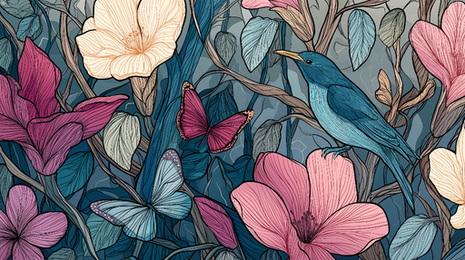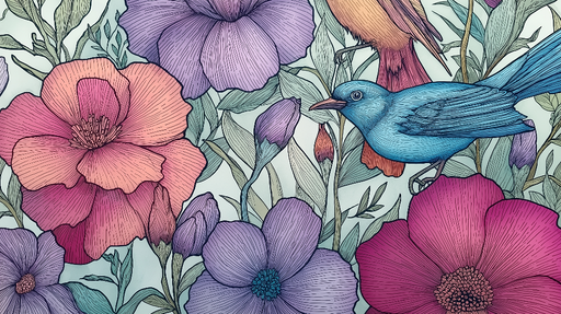 WonderMuralUpptäck vår Fototapet med blommor som för tankarna till en frodig trädgård, med en mix av livliga blommor och färgglada fåglar. Nyanserna av rosa, ...