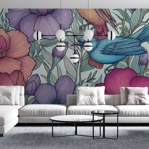 WonderMuralVår Fototapet framhäver ett livligt mönster av stiliserade blommor och färgglada fåglar, vilket skapar en glad och livlig atmosfär. Nyanserna av ro...