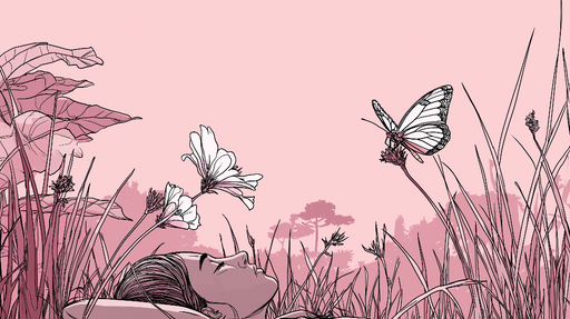 Visa fullständiga detaljerFototapet blommig och fjäril | Kvinna vilar i en blomsteräng under en rosa himmel