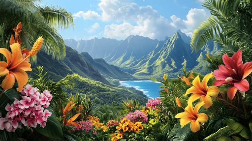 WonderMuralUpptäck vår tapet som representerar en präktig tropisk landskap, där naturen blomstrar i en explosion av färger. Majestätiska berg står i bakgrunde...