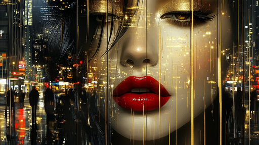 Art'loloDenna glamorösa urbana fototapet har en konstnärlig fusion av ett djärvt ansikte med ljusröda läppar och en upplyst stadsbild. Perfekt för att lägg...
