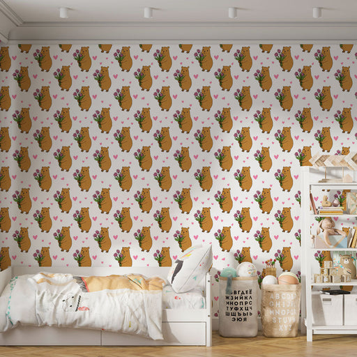 WonderMuralDenna charmiga fototapet har bedårande björnar som håller buketter av blommor på en mjuk rosa bakgrund. Varje björn, med sitt glada uttryck, ger en...