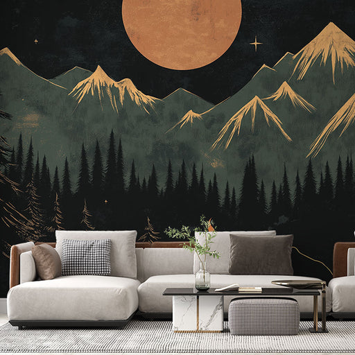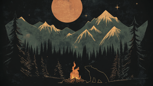 WonderMuralDenna fängslande fototapet visar en förtrollad natt i vildmarken, med en björn som sitter fridfullt vid en lägereld, omgiven av majestätiska berg o...
