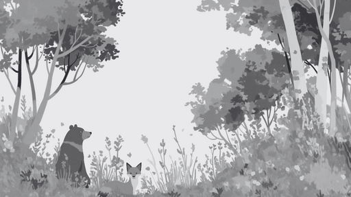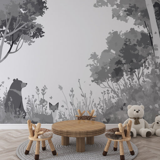 WonderMuralVår Fototapet väcker en lugnande atmosfär med sin känsliga illustration av en björn och en räv som vilar mitt i en frodig skog. Gråtonerna skapar e...