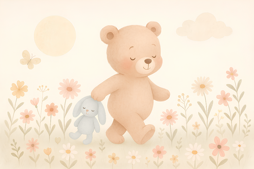 WonderMuralDenna bedårande fototapet har en glad björn som går med sin blåa kanin, omgiven av delikata pastellblommor. De mjuka och lugnande färgerna skapar e...