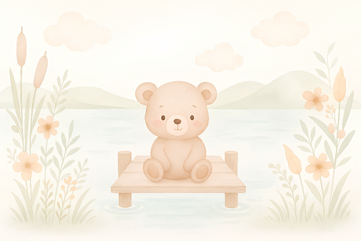 WonderMuralUpptäck vår bedårande fototapet med en nallebjörn som sitter på en brygga vid en lugn sjö, omgiven av delikata blommor och milda landskap. Pastellf...