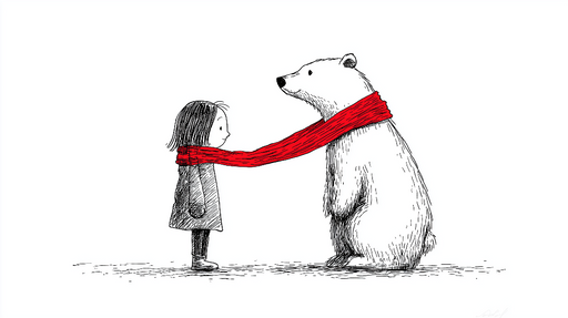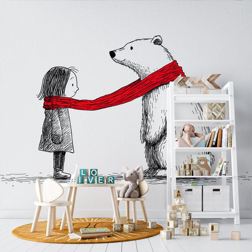 Visa fullständiga detaljerFototapet isbjörn och barn | Öm scen med en björn och en flicka som bär en röd halsduk