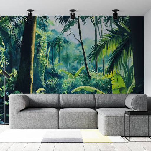 WonderMuralDenna tapetmålning för tankarna till en hemlighetsfull djungel insvept i dimma, där majestätiska palmträd står mitt i frodig vegetation. Den subtil...