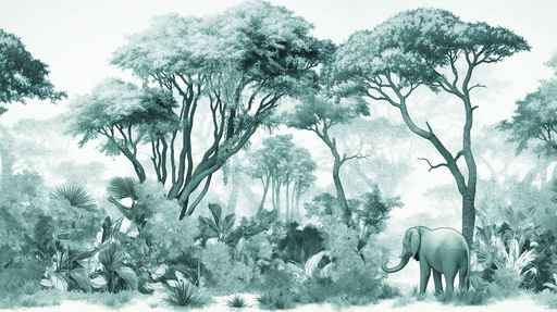 WonderMuralVår tapet har en djungelscen med en majestätisk elefant som trivs i en frodig landskap. De mjuka nyanserna av grönt och blått skapar en lugnande at...