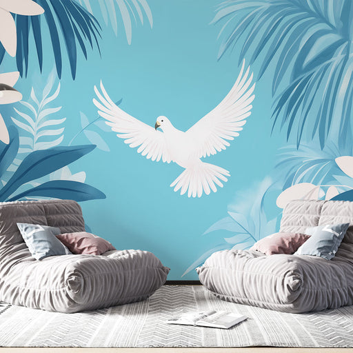 WonderMuralDenna magnifika teal-fototapet är prydd med frodiga palmer och en vacker duva i flykt, vilket ger en touch av friskhet och elegans till alla inter...