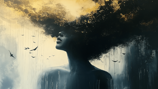 WonderMuralDenna tapet framhäver en fängslande konstnärlig porträtt, som skildrar en stiliserad kvinnlig silhuett vars huvud omges av moln som spricker med mö...