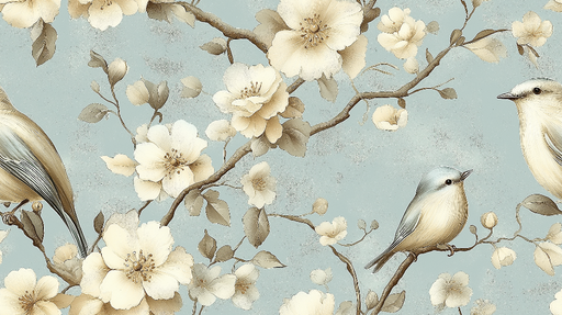Visa fullständiga detaljerTapet shabby chic | Delikata blommor och sjungande fåglar