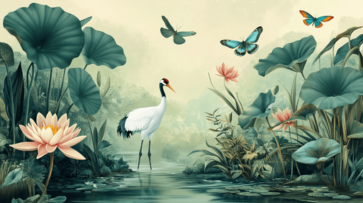 Art'loloDenna tapet med naturmotiv visar en fridfull scen med en elegant trana som står i en fridfull damm, omgiven av stora lotusblad och färgglada fjäril...