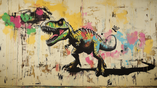 WonderMuralDenna unika tapetmålning har en fängslande graffiti av en livlig Tyrannosaurus Rex i starka färger, som majestätiskt står på en pastellbakgrund stä...