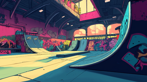 WonderMuralDenna livfulla fototapet visar en inomhusskatepark badad i starka färger, med stora skateboardramper och konstnärlig graffiti som tillför en touch ...