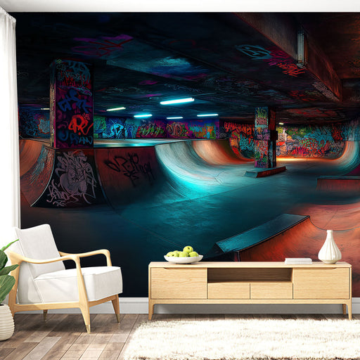 WonderMuralDenna fototapet fångar en dynamisk och modern skatepark-atmosfär, där färggraffiti täcker väggarna och ger en touch av liv och kreativitet till dit...