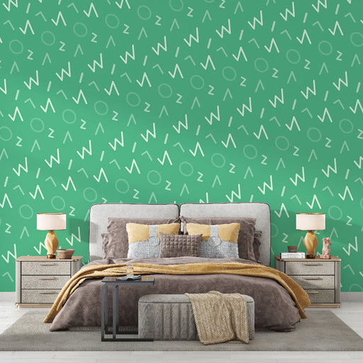 Studio Sama```html Upptäck vår geometriska tapet med vita bokstäver och symboler på en lugnande grön bakgrund. Det här djärva och moderna mönstret är perfekt ...