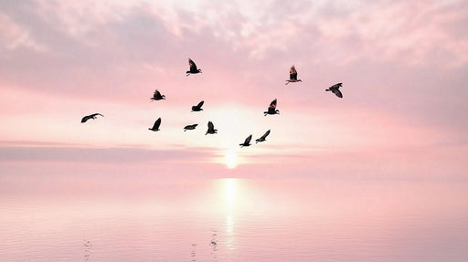 Art'loloFörvandla ditt utrymme med vår fototapet med fåglar i flykt. Denna fängslande design har fåglar elegant arrangerade mot en himmel av rosa nyanser, ...