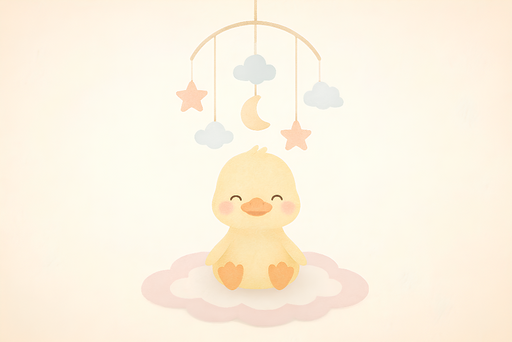 WonderMuralDenna förtrollande Fototapet visar en bedårande anka som sitter på en mjuk moln, omgiven av små luftiga element som stjärnor och moln. Pastellfärge...