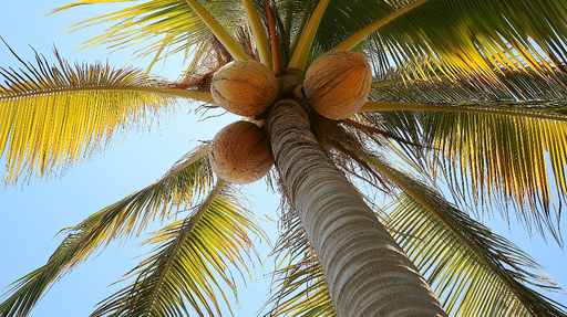 WonderMuralDenna livfulla fototapet framhäver ett magnifikt palmmönster med frodiga blad och hängande kokosnötter, allt under en klarblå himmel. Nyanserna av ...