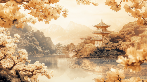WonderMuralVår fototapet representerar en vacker orientalisk landskap, med eleganta pagoder och delikata blommor i mjuka nyanser. Bergen i bakgrunden och den ...