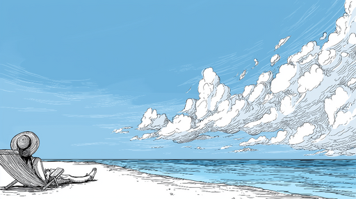 WonderMuralDenna tapet illustrerar en vacker strand scen där en karaktär kopplar av i en solstol och betraktar en blå himmel prickad med stiliserade moln. Den...
