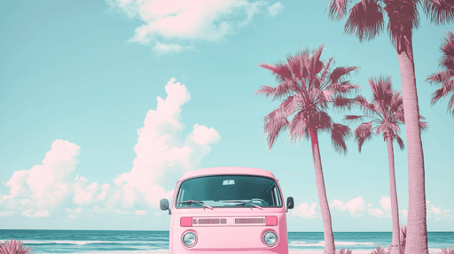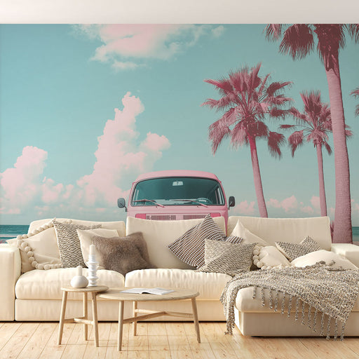 WonderMuralDenna livfulla fototapet har en ikonisk rosa van parkerad på en solig strand, omgiven av palmer och en ljusblå himmel prickad med rosa moln. Sommar...