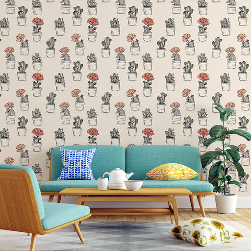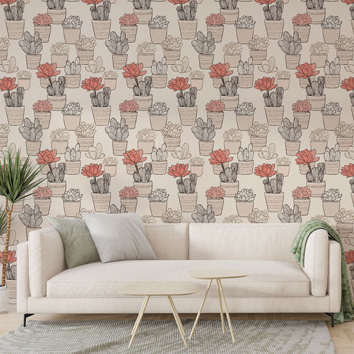 WonderMuralVår levande Fototapet har ett mönster av stiliserade kaktusar i nyanser av korall på en beige bakgrund, vilket skapar en lekfull atmosfär i ditt he...