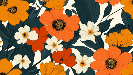 WonderMuralDenna tapet har ett magnifikt blommönster med blommor i ljusa färger, inklusive orange och korallblommor, varsamt omgivna av gröna blad. De handrit...