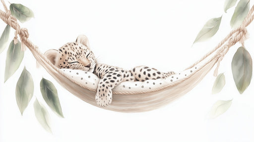 Art'loloOmvandla ditt barns rum till en drömutrymme med vår fototapet för barn med en bedårande sovande babyleopard i en hängmatta. De ljusa löven som omge...