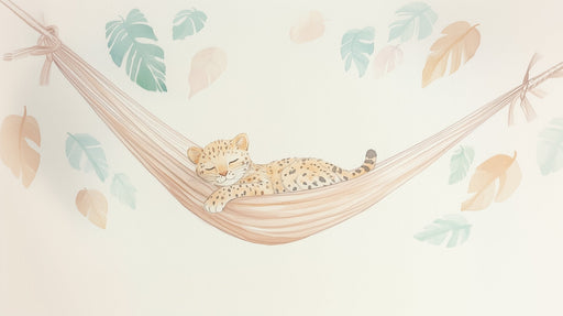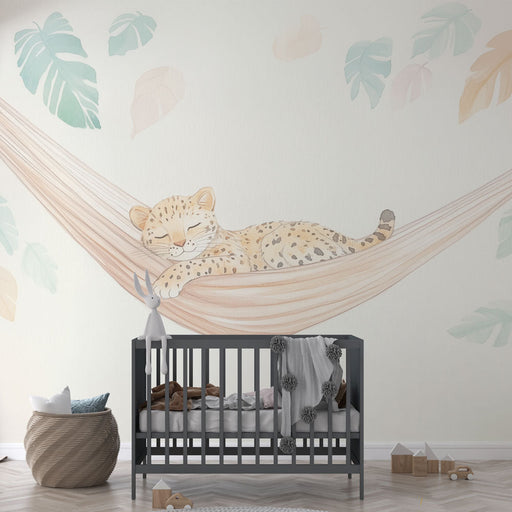 Art'loloDenna fototapet har en sovande leopard i en hängmatta, omgiven av mjuka blad, vilket skapar en lugnande och lekfull atmosfär för ett barns sovrum. ...