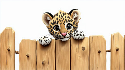 Art'loloDenna Fototapet har en bedårande lekfull babyleopard som tittar över ett trästaket. Perfekt för ett barnrum eller lekrum, det ger en rolig och char...