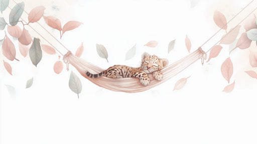 Art'loloDenna bedårande Fototapet leopard visar en fridfullt sovande babyleopard i en hängmatta omgiven av mjuka toner av rosa och beige löv. Perfekt för a...
