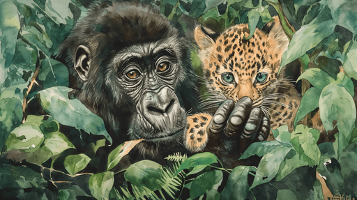 WonderMuralThe Jungle Companions Denna tapet fångar en öm och oväntad scen mellan en ung gorilla och en leopard, båda inramade av riklig djungelväxt. De detal...