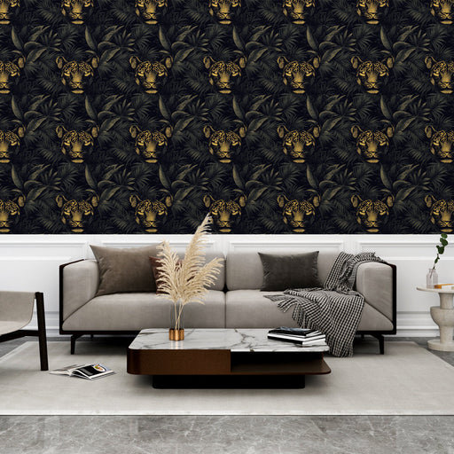 WonderMuralVår vackra fototapet har ett mönster av guldfärgade leoparder mot en svart bakgrund, omgiven av en frodighet av tropiska blad. De mystiska och maje...