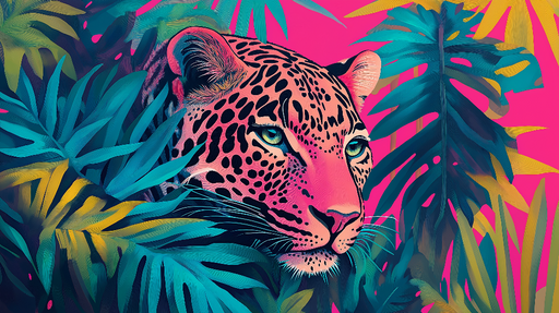Visa fullständiga detaljerTapet leopard | En livlig leopard i en färgglad tropisk djungel